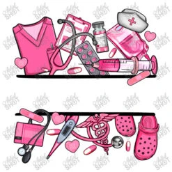 Plot Printing Consists of both Flock and Flex Print, This process transfers your artwork “Personalized Pink Nurse” from a special foil through an immense amount of pressure and heat. Flex images are smooth, a little plastic like and a tad bit glossy. Flock images have a fuzzy velvet-like texture and appear slightly more elevated. Think of drawing just the shadows and how that would appear without color. 3 colors plus the color of the garment itself is used to print.